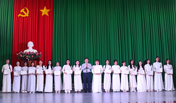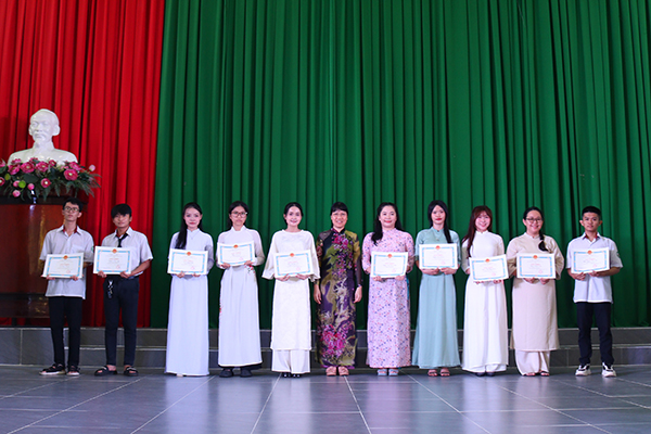 Cô Nguyễn Thị Kim Chi, Trưởng Khoa Ngoại ngữ - Tin học trao Giấy khen cho sinh viên Xuất sắc Khoa Ngoại ngữ - Tin học