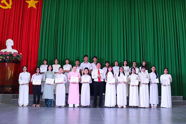 Thầy Nguyễn Xuân Dũng, Phó Bí thư Đảng ủy, Phó Hiệu trưởng – Chủ tịch Hội Khuyến học nhà trường trao Học bồng Khuyến học cho sinh viên có hoàn cảnh khó khăn nỗ lực vươn lên trong học tập