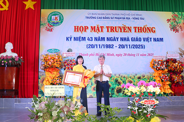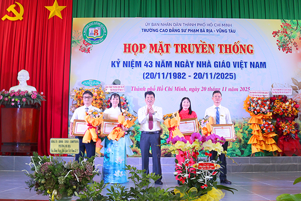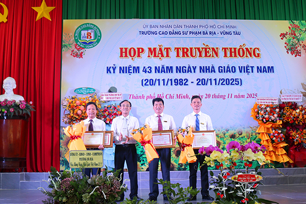 Thầy Phan Thế Hải trao Bằng khen của Bộ trưởng Bộ Giáo dục và Đào tạo cho Tập thể Phòng Quản lý khoa học, Khảo thí và Bảo đảm chất lượng và Thầy Bùi Quang Trường; trao Bằng khen của Chủ tịch UBND Thành phố về điển hình tiên tiến giai đoạn 2020 – 2025 cho Thầy Nguyễn Xuân Dũng và Thầy Bùi Quang Trường.