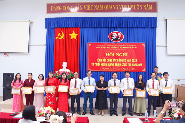 Tại Hội nghị, Đảng ủy Trường đã tổ chức trao Giấy khen cho các tập thể, cá nhân đạt thành tích xuất sắc trong công tác năm 2025, gồm: Chi bộ khoa Giáo dục Mầm Non đạt thành tích “Hoàn thành xuất sắc nhiệm vụ tiêu biểu”; 12 đảng viên về thành tích “Hoàn thành xuất sắc nhiệm vụ”;08 đảng viên về thành tích trong học tập và làm theo tư tưởng, đạo đức, phong cách Hồ Chí Minh chuyên đề năm 2025.