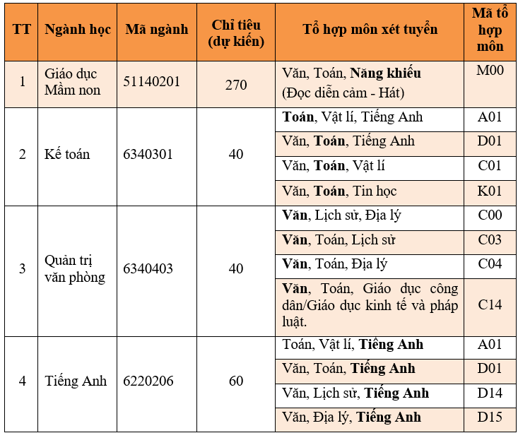 Ghi chú: Môn in đậm trong tổ hợp xét tuyển là môn chính. Đối với ngành Tiếng Anh, môn Tiếng Anh được nhân hệ số 2 và quy về thang điểm 30.