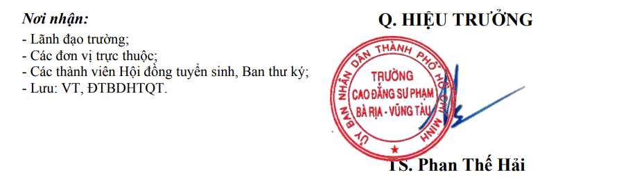 Chú ý: Đối với trường hợp sử dụng kết quả thi năng khiếu do cơ sở đào tạo khác tổ chức, thí sinh phải nộp bổ sung bản gốc Giấy chứng nhận kết quả thi Năng khiếu ngay sau khi có kết quả thi về Nhà trường để đối chiếu, bằng hình thức chuyển phát nhanh qua đường bưu điện hoặc nộp trực tiếp về Trường qua địa chỉ phòng Đào tạo - Bồi dưỡng và Hợp tác Quốc tế (phòng 301), Trường Cao đẳng Sư phạm Bà Rịa - Vũng Tàu; số 689, đường Cách Mạng Tháng Tám, phường Bà Rịa, Thành phố Hồ Chí Minh.