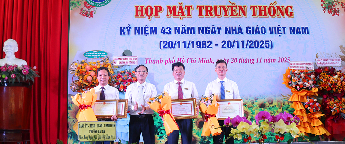 Thầy Phan Thế Hải trao Bằng khen của Bộ trưởng Bộ Giáo dục và Đào tạo cho Tập thể Phòng Quản lý khoa học, Khảo thí và Bảo đảm chất lượng và Thầy Bùi Quang Trường; trao Bằng khen của Chủ tịch UBND Thành phố về điển hình tiên tiến giai đoạn 2020 – 2025 cho Thầy Nguyễn Xuân Dũng và Thầy Bùi Quang Trường.